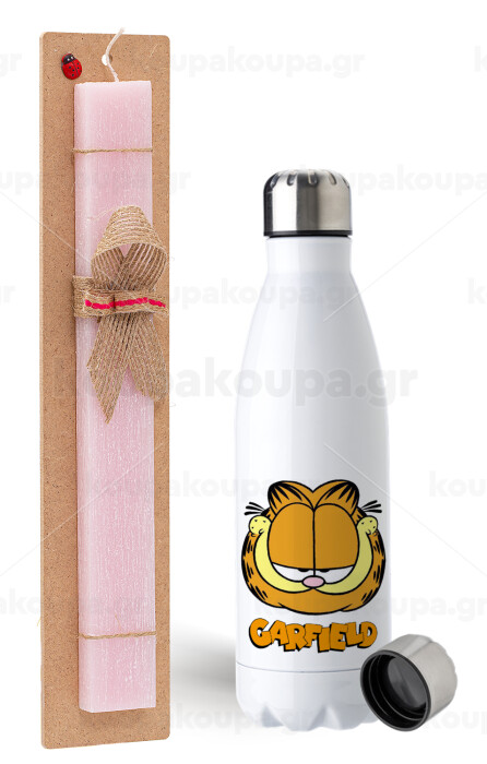 Garfield, Easter Set, metallic stainless steel water bottle (750ml) & scented flat Easter candle (30cm) (PINK)