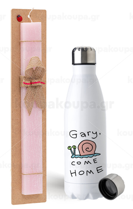 Gary come home, Easter Set, metallic stainless steel water bottle (750ml) & scented flat Easter candle (30cm) (PINK)