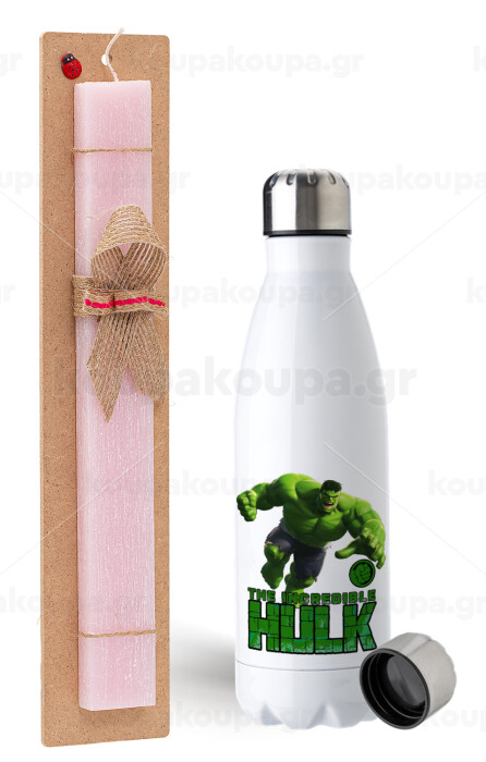 Hulk, Easter Set, metallic stainless steel water bottle (750ml) & scented flat Easter candle (30cm) (PINK)