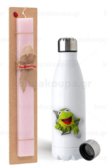 Kermit the frog, Easter Set, metallic stainless steel water bottle (750ml) & scented flat Easter candle (30cm) (PINK)