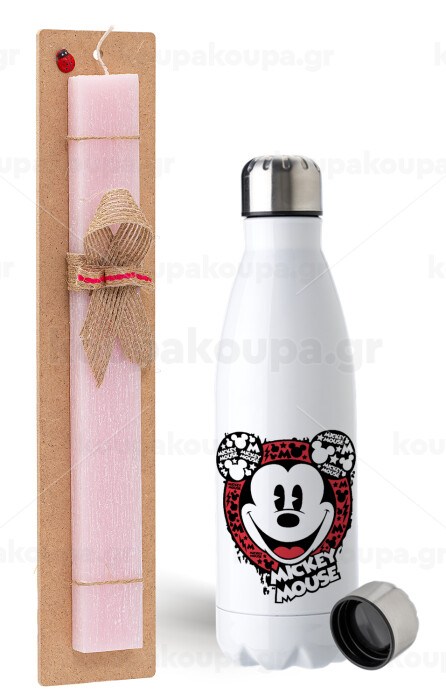 Mickey Mouse, Easter Set, metallic stainless steel water bottle (750ml) & scented flat Easter candle (30cm) (PINK)