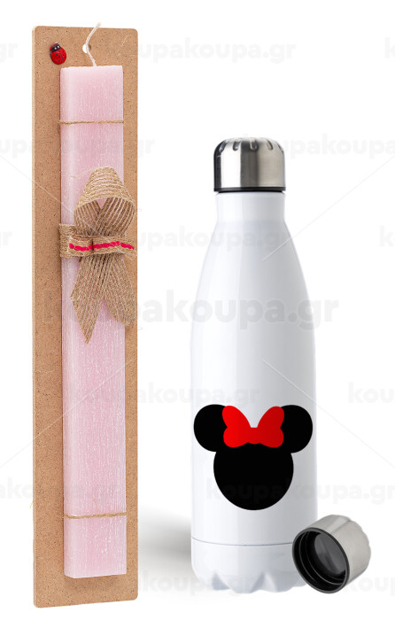 Minnie head, Easter Set, metallic stainless steel water bottle (750ml) & scented flat Easter candle (30cm) (PINK)