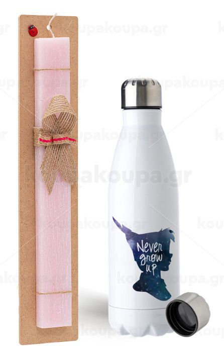 Never Grow UP, Easter Set, metallic stainless steel water bottle (750ml) & scented flat Easter candle (30cm) (PINK)