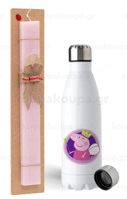 Peppa pig Queen, Easter Set, metallic stainless steel water bottle (750ml) & scented flat Easter candle (30cm) (PINK)