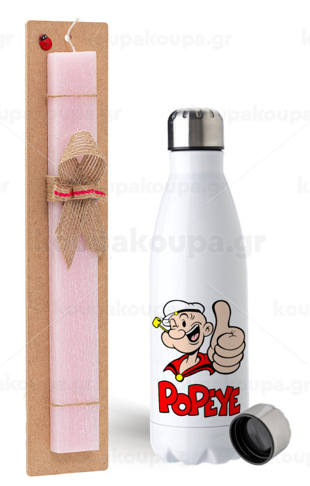 Popeye the sailor man, Easter Set, metallic stainless steel water bottle (750ml) & scented flat Easter candle (30cm) (PINK)