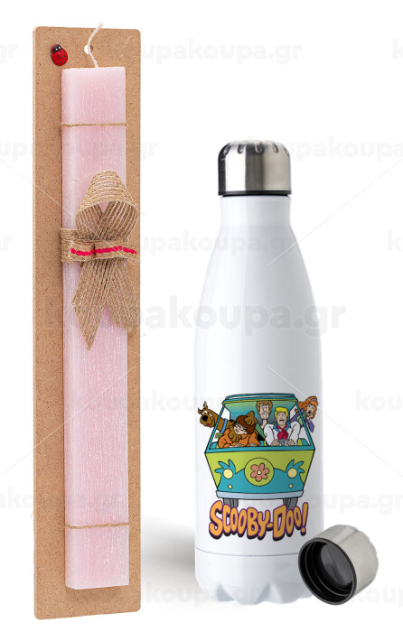 Scooby Doo car, Easter Set, metallic stainless steel water bottle (750ml) & scented flat Easter candle (30cm) (PINK)