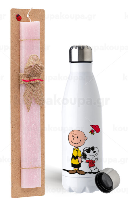 Snoopy & Joe, Easter Set, metallic stainless steel water bottle (750ml) & scented flat Easter candle (30cm) (PINK)