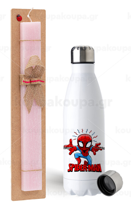 Spiderman flying, Easter Set, metallic stainless steel water bottle (750ml) & scented flat Easter candle (30cm) (PINK)