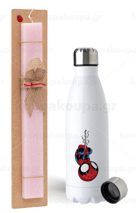 Spiderman upside down, Easter Set, metallic stainless steel water bottle (750ml) & scented flat Easter candle (30cm) (PINK)