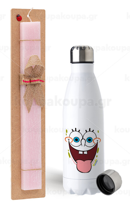 SpongeBob SquarePants smile, Easter Set, metallic stainless steel water bottle (750ml) & scented flat Easter candle (30cm) (PINK)