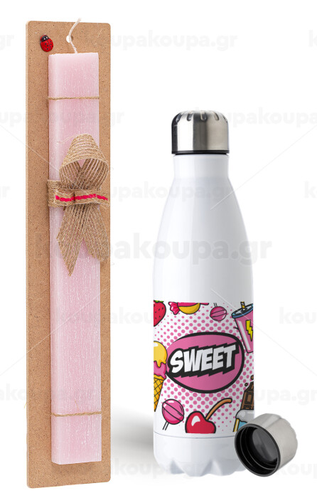 SWEET, Easter Set, metallic stainless steel water bottle (750ml) & scented flat Easter candle (30cm) (PINK)