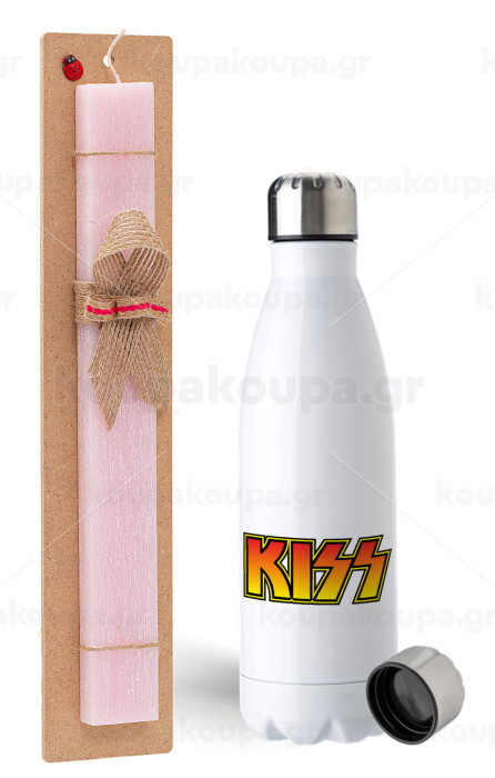 KISS, Easter Set, metallic stainless steel water bottle (750ml) & scented flat Easter candle (30cm) (PINK)