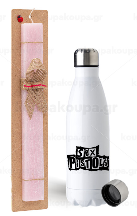 Sex Pistols, Easter Set, metallic stainless steel water bottle (750ml) & scented flat Easter candle (30cm) (PINK)