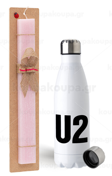 U2 , Easter Set, metallic stainless steel water bottle (750ml) & scented flat Easter candle (30cm) (PINK)