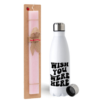 Wish you were here, Easter Set, metallic stainless steel water bottle (750ml) & scented flat Easter candle (30cm) (PINK)