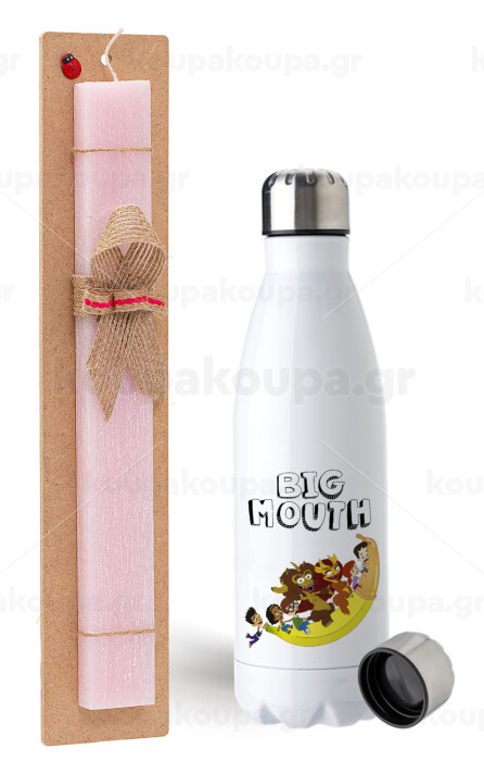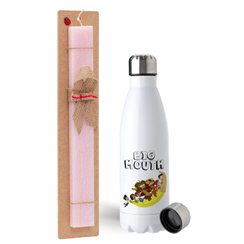 Big mouth, Easter Set, metallic stainless steel water bottle (750ml) & scented flat Easter candle (30cm) (PINK)