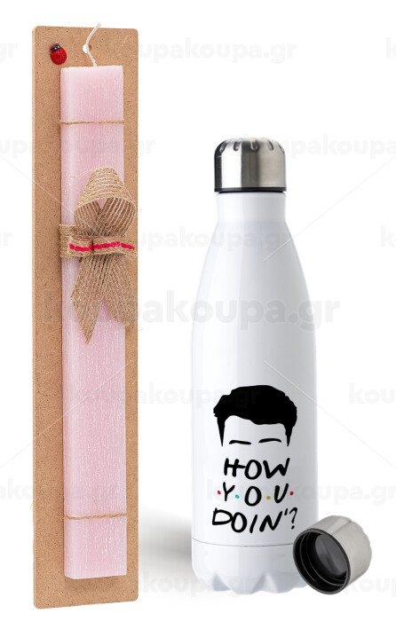 Friends how you doin?, Easter Set, metallic stainless steel water bottle (750ml) & scented flat Easter candle (30cm) (PINK)
