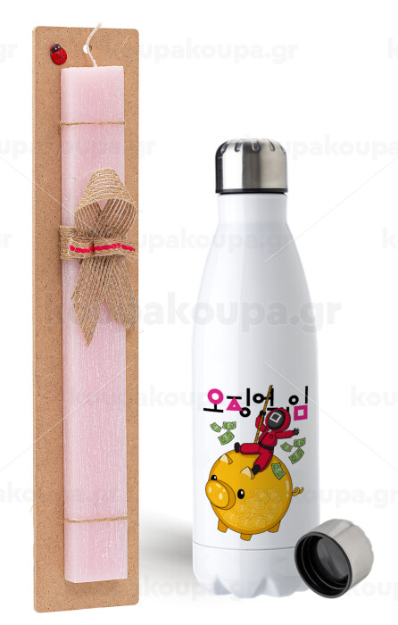 Squid game money pig, Easter Set, metallic stainless steel water bottle (750ml) & scented flat Easter candle (30cm) (PINK)
