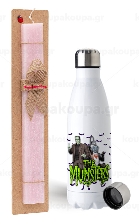 The munsters, Easter Set, metallic stainless steel water bottle (750ml) & scented flat Easter candle (30cm) (PINK)