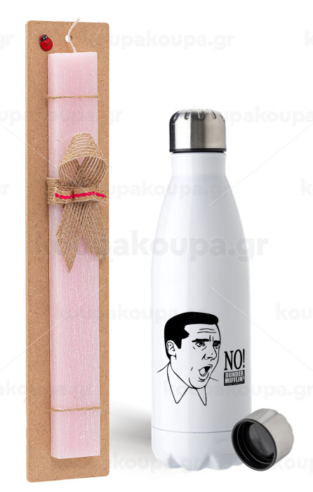 The office Michael NO!!!, Easter Set, metallic stainless steel water bottle (750ml) & scented flat Easter candle (30cm) (PINK)