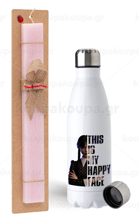 Wednesday, This is my happy face, Easter Set, metallic stainless steel water bottle (750ml) & scented flat Easter candle (30cm) (PINK)