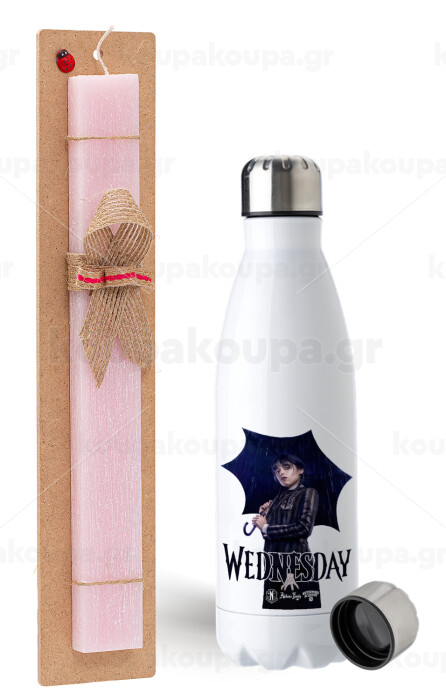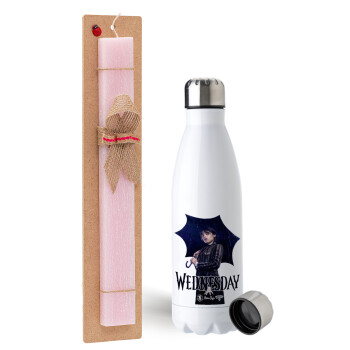 Wednesday rain, Easter Set, metallic stainless steel water bottle (750ml) & scented flat Easter candle (30cm) (PINK)