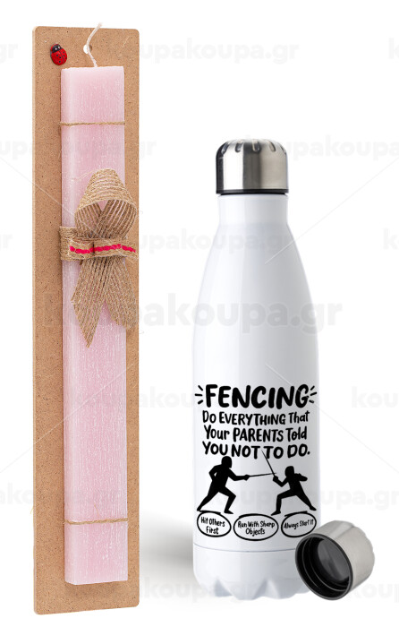 Fencing, do everything that your parents told you not to do., Easter Set, metallic stainless steel water bottle (750ml) & scented flat Easter candle (30cm) (PINK)