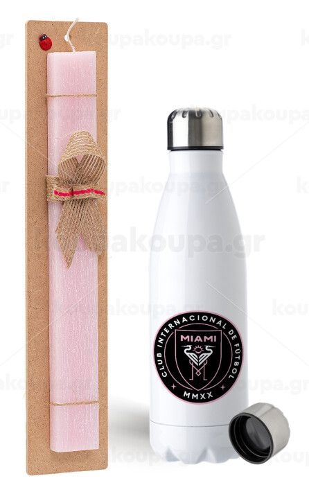 Inter Miami CF, Easter Set, metallic stainless steel water bottle (750ml) & scented flat Easter candle (30cm) (PINK)