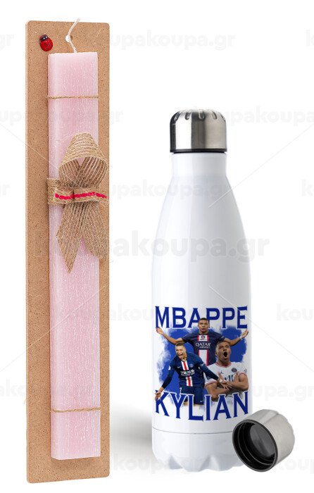 Kylian Mbappé, Easter Set, metallic stainless steel water bottle (750ml) & scented flat Easter candle (30cm) (PINK)