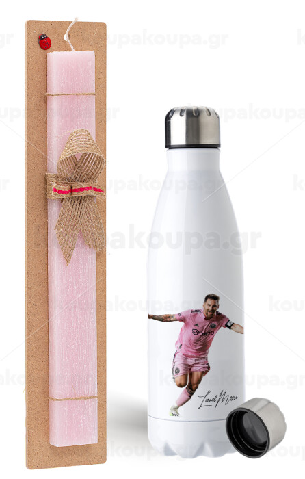 Lionel Messi inter miami jersey, Easter Set, metallic stainless steel water bottle (750ml) & scented flat Easter candle (30cm) (PINK)