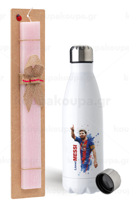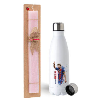 Lionel Messi, Easter Set, metallic stainless steel water bottle (750ml) & scented flat Easter candle (30cm) (PINK)
