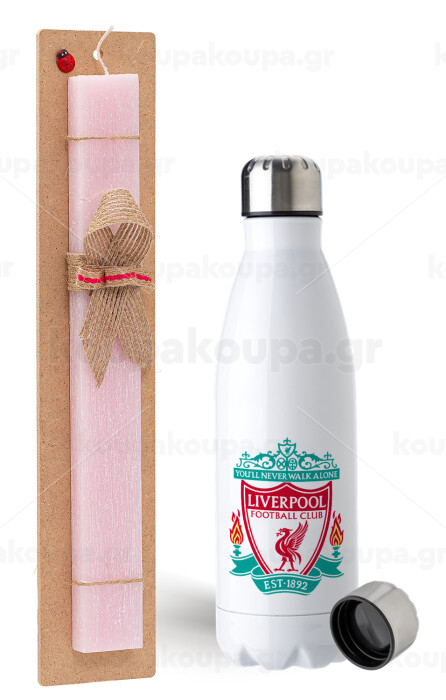 Liverpool, Easter Set, metallic stainless steel water bottle (750ml) & scented flat Easter candle (30cm) (PINK)