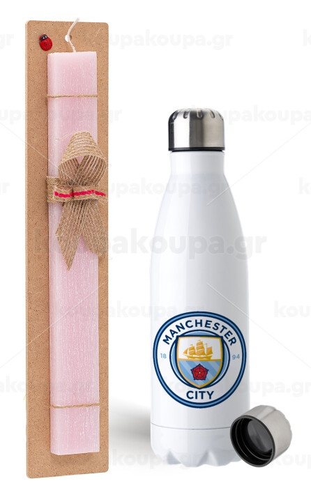 Manchester City FC , Easter Set, metallic stainless steel water bottle (750ml) & scented flat Easter candle (30cm) (PINK)