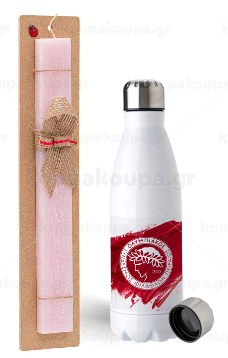 Olympiacos F.C., Easter Set, metallic stainless steel water bottle (750ml) & scented flat Easter candle (30cm) (PINK)
