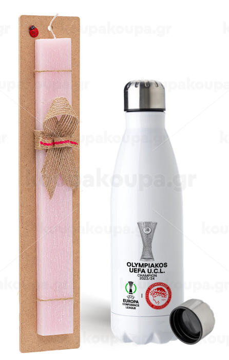 Olympiacos UEFA Europa Conference League Champion 2023/24, Easter Set, metallic stainless steel water bottle (750ml) & scented flat Easter candle (30cm) (PINK)