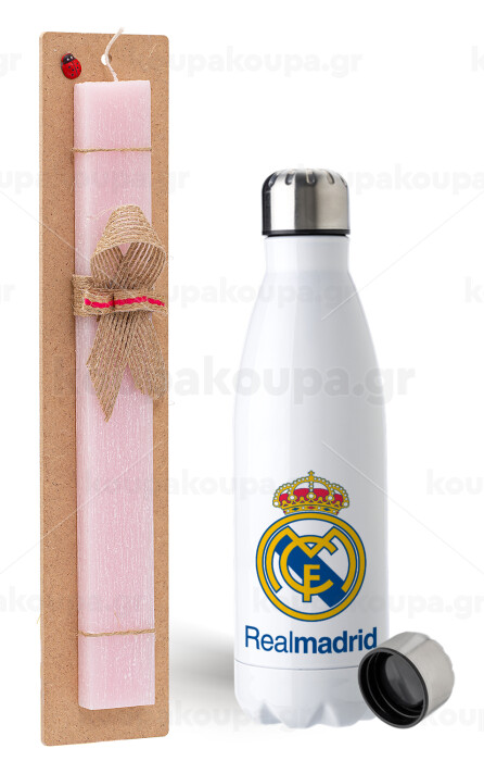 Real Madrid CF, Easter Set, metallic stainless steel water bottle (750ml) & scented flat Easter candle (30cm) (PINK)