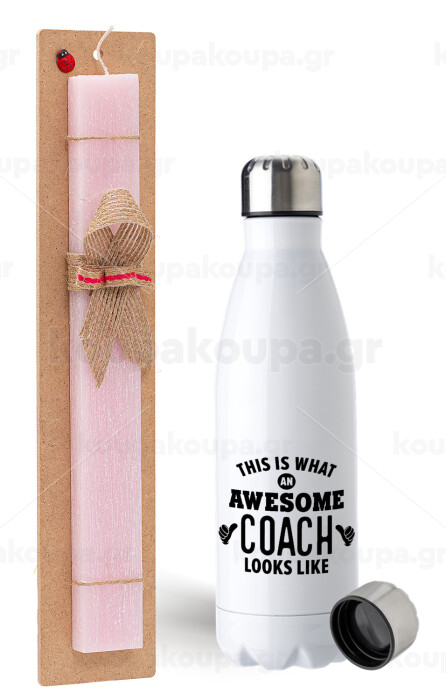 This is what an awesome COACH looks like!, Easter Set, metallic stainless steel water bottle (750ml) & scented flat Easter candle (30cm) (PINK)