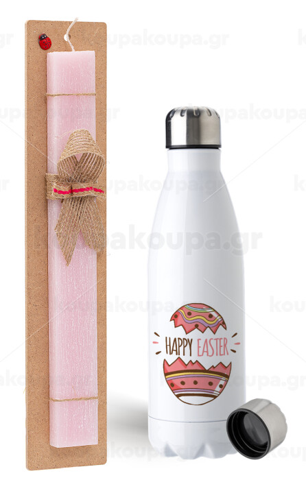 Happy easter egg, Easter Set, metallic stainless steel water bottle (750ml) & scented flat Easter candle (30cm) (PINK)