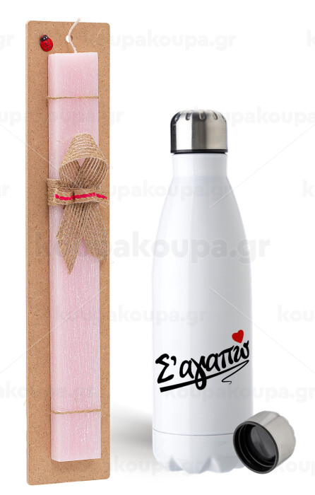 Σ΄ αγαπώ!!!, Easter Set, metallic stainless steel water bottle (750ml) & scented flat Easter candle (30cm) (PINK)