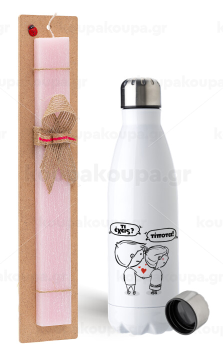 Τι έχεις? Τίποτα!, Easter Set, metallic stainless steel water bottle (750ml) & scented flat Easter candle (30cm) (PINK)