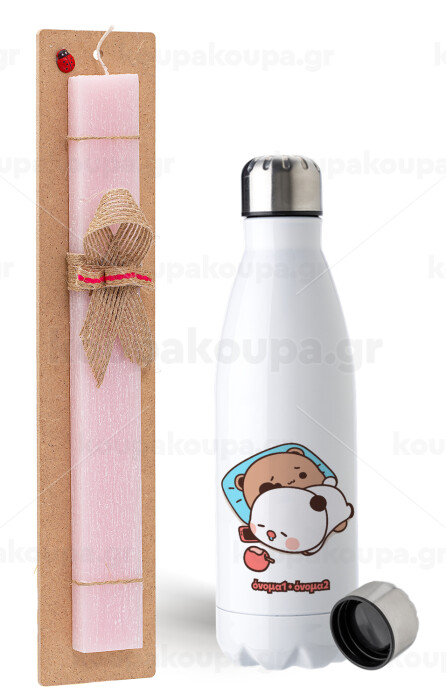 bubu + dudu, Easter Set, metallic stainless steel water bottle (750ml) & scented flat Easter candle (30cm) (PINK)