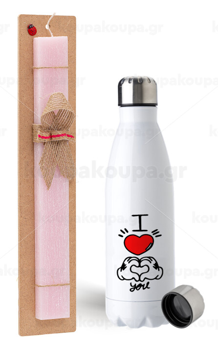 comics hands love, Easter Set, metallic stainless steel water bottle (750ml) & scented flat Easter candle (30cm) (PINK)