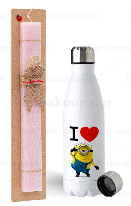 I love by minion, Easter Set, metallic stainless steel water bottle (750ml) & scented flat Easter candle (30cm) (PINK)