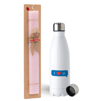 I Love You text message, Easter Set, metallic stainless steel water bottle (750ml) & scented flat Easter candle (30cm) (PINK)