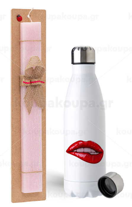 Lips, Easter Set, metallic stainless steel water bottle (750ml) & scented flat Easter candle (30cm) (PINK)