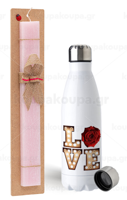 Love lights and roses, Easter Set, metallic stainless steel water bottle (750ml) & scented flat Easter candle (30cm) (PINK)