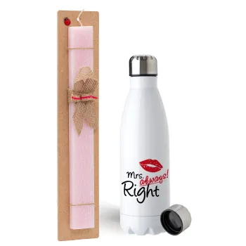 Mrs always right kiss, Easter Set, metallic stainless steel water bottle (750ml) & scented flat Easter candle (30cm) (PINK)
