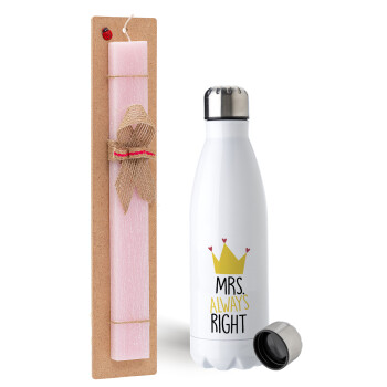 Mrs "Always" right, Easter Set, metallic stainless steel water bottle (750ml) & scented flat Easter candle (30cm) (PINK)