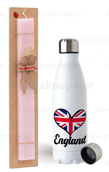 England flag, Easter Set, metallic stainless steel water bottle (750ml) & scented flat Easter candle (30cm) (PINK)