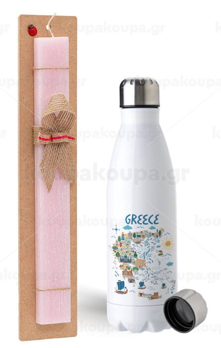 Greek map, Easter Set, metallic stainless steel water bottle (750ml) & scented flat Easter candle (30cm) (PINK)